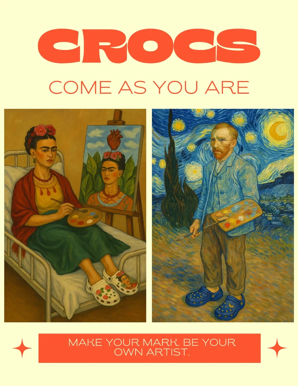 For my ad design, I decided to lean into my background as a visual artist and tried using AI to create the images of artists with a pair of crocs matching their artistic style. The artists pictured are Frida Kahlo and Vincent Van Gogh, both of whom are very expressive and emotional painters. Including both of these artists mimicked the diversity seen in many of the crocs ads, with individuals featured from different backgrounds and experiences. I wanted to evoke the joy of finding the perfect pair of shoes that match your style. This ad appeals to emotions tied to one's sense of belonging and confidence through demonstrating there are crocs that can match anyone's style. In an era of insecurity, this ad demonstrates that comfort and personality and not mutually exclusive, and it provides inspiration for people to express themselves similarly to artists through their shoes choices. I added the tagline "Make your mark. Be your own artist" to inspire people to think of themselves as curators of their own style and fashion as a way of being creative and having agency.